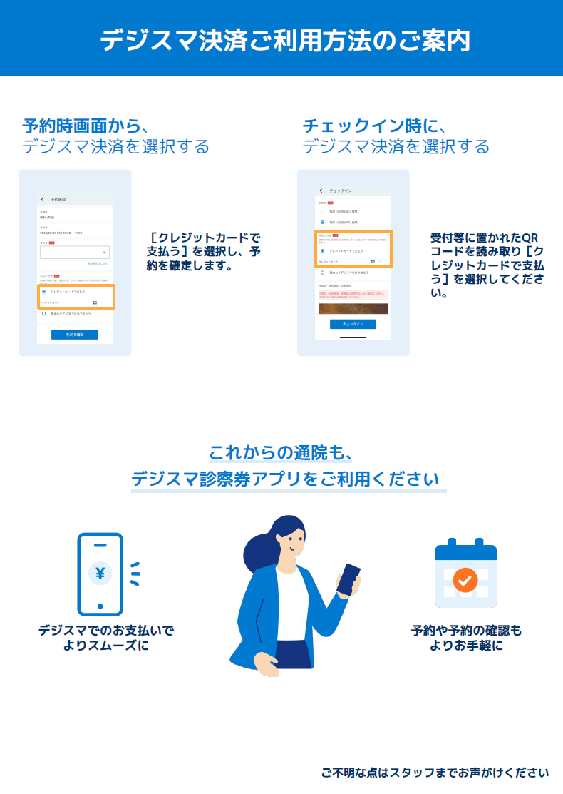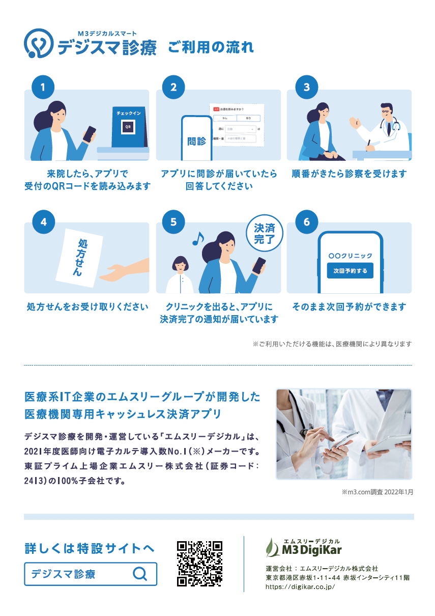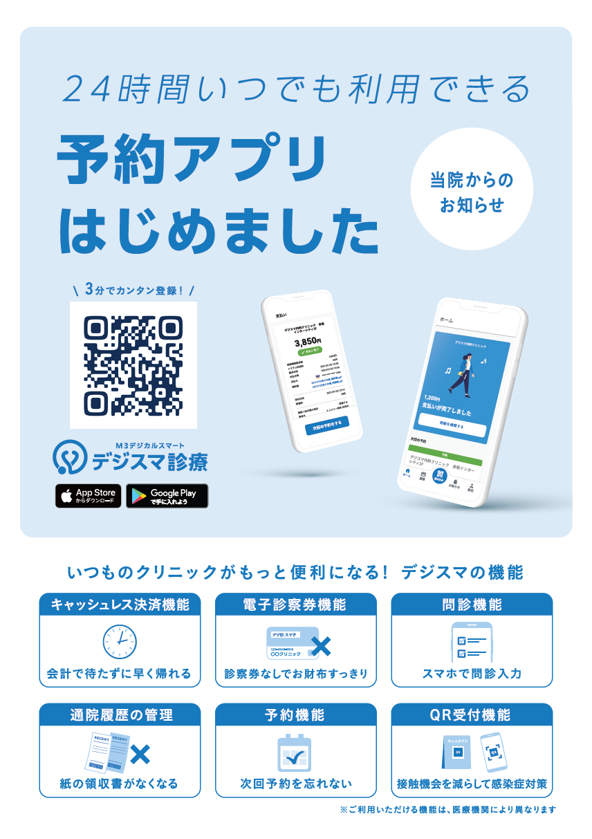 当院では、予約から問診、会計まで一連の流れをスムーズに行える「デジスマ診療」を導入しております。簡単予約、事前問診(来院後の待ち時間短縮)、キャッシュレス決済(会計で待たずに早く帰れる)などのメリットがあります。