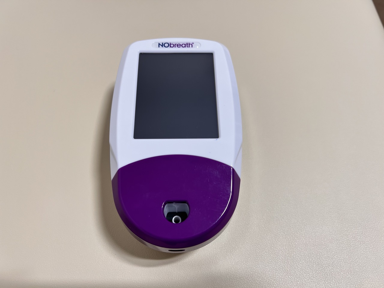 吐いた息の中の一酸化窒素(NO)濃度を測定し、喘息による気道の炎症を調べます。