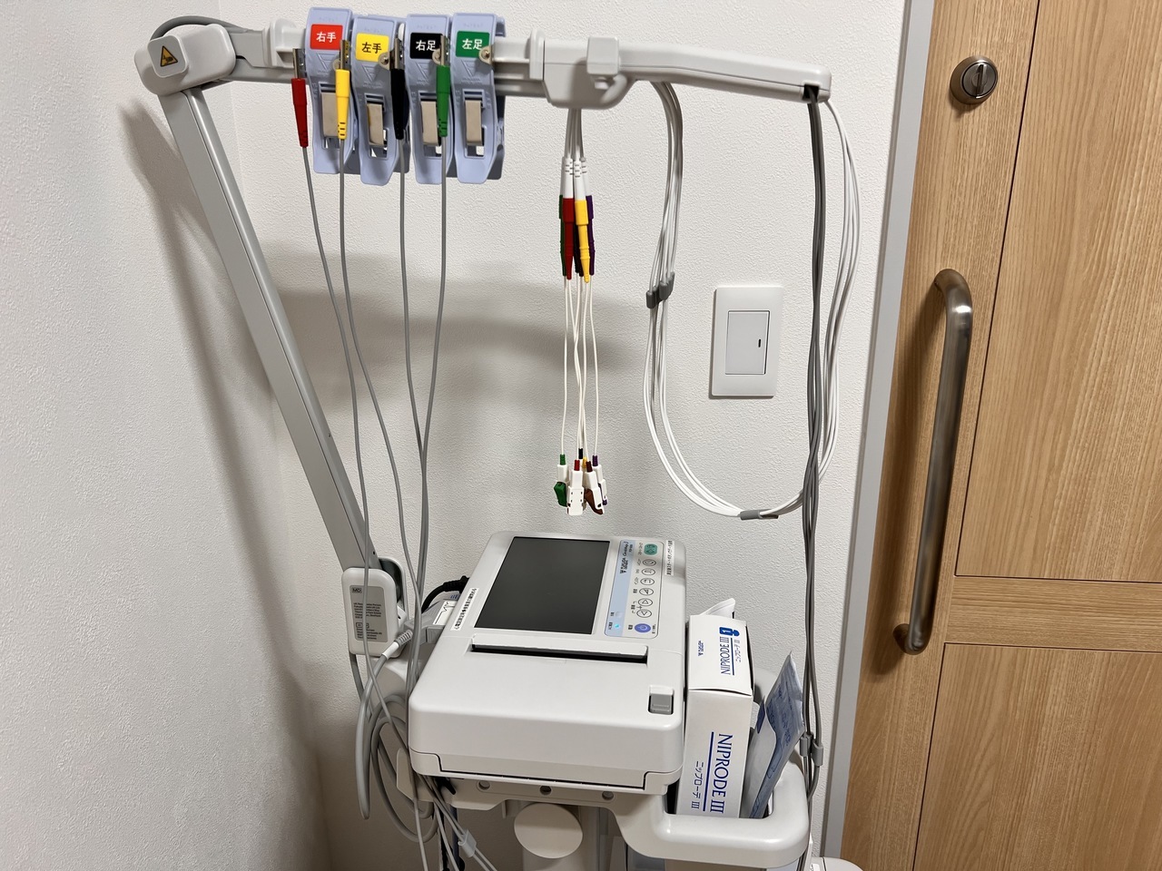 心臓の電気的な活動を調べます。不整脈、虚血性心疾患(狭心症や心筋梗塞)、心肥大などを評価します。